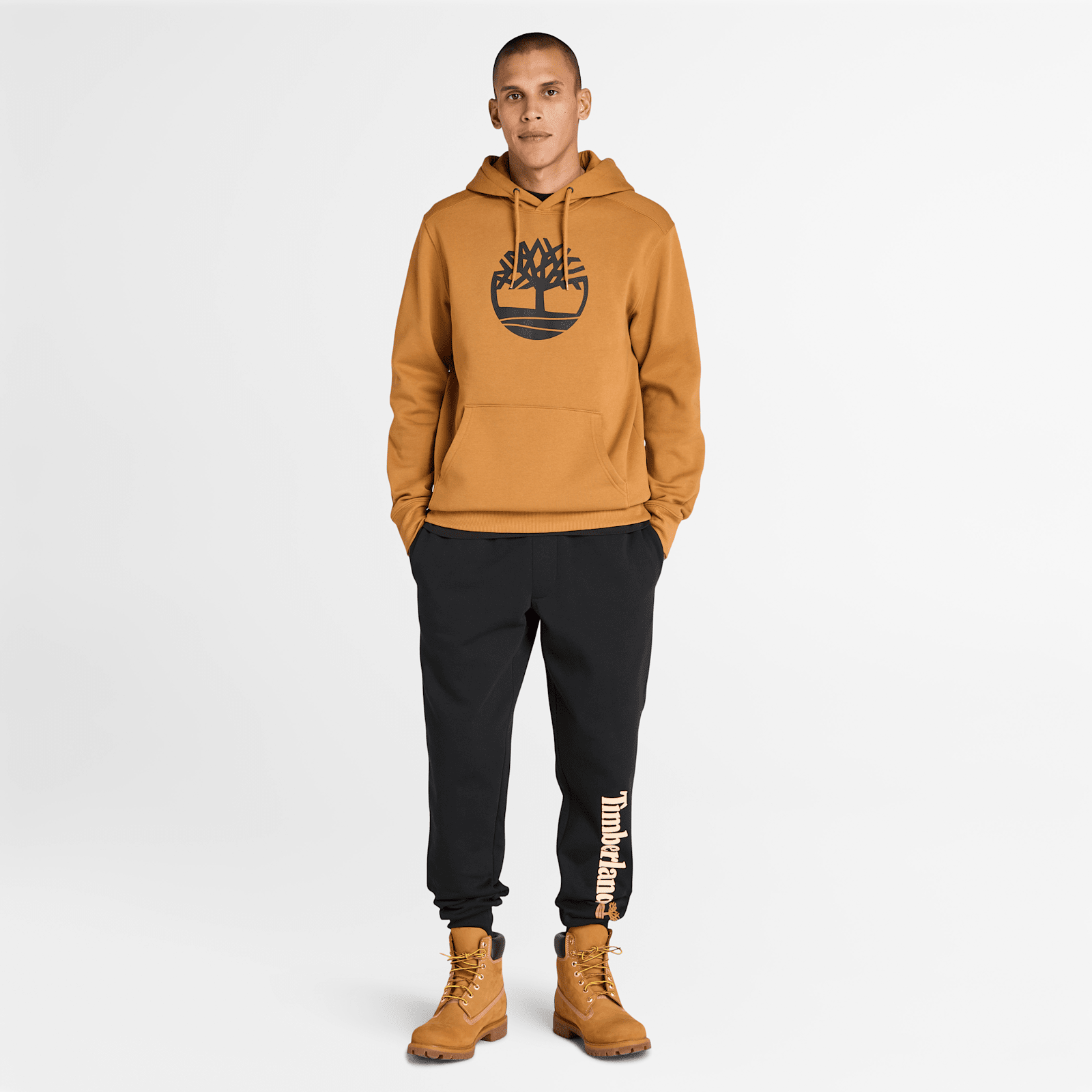 These sweatpants are comprised of 85% cotton and 15% polyester, featuring a large Timberland logo on the leg, a regular fit, and convenient side pockets.
