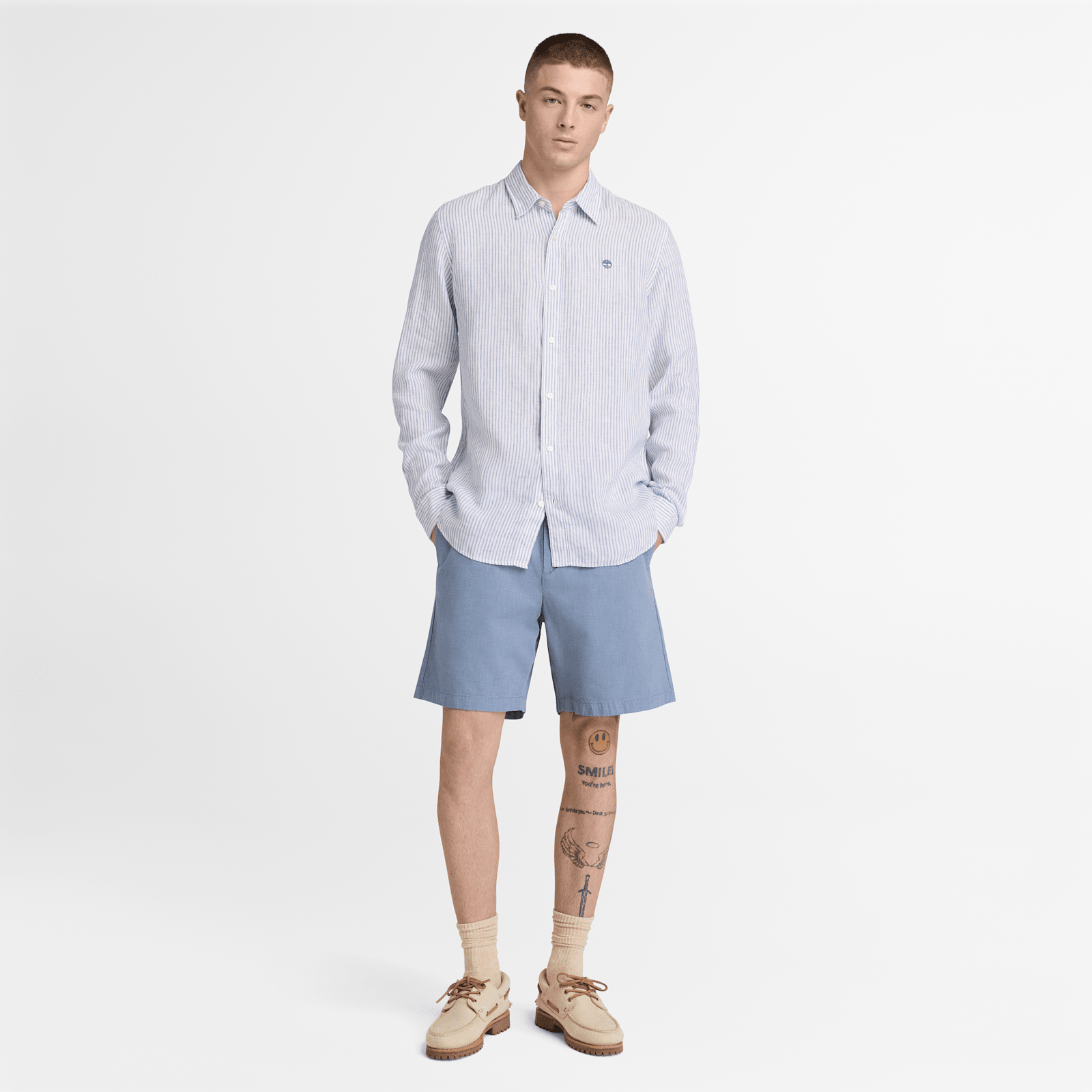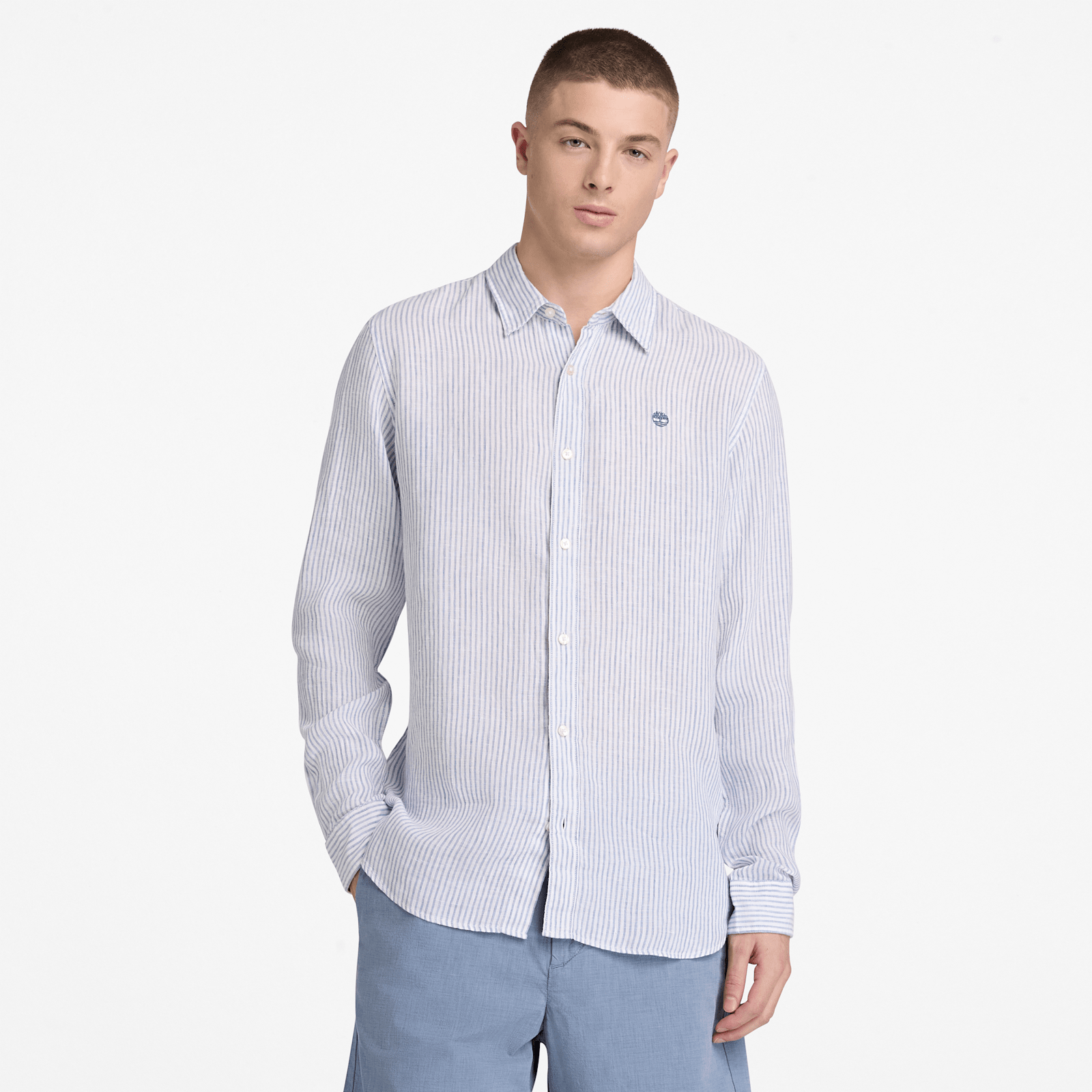 A refined classic. The linen-cotton blend helps deliver an easy drape and cool style in a regular fit, with stripes that fit in from the workday to the weekend. Complete with a button opening and an embroidered Timberland tree logo, it's a polished staple and a timeless silhouette.