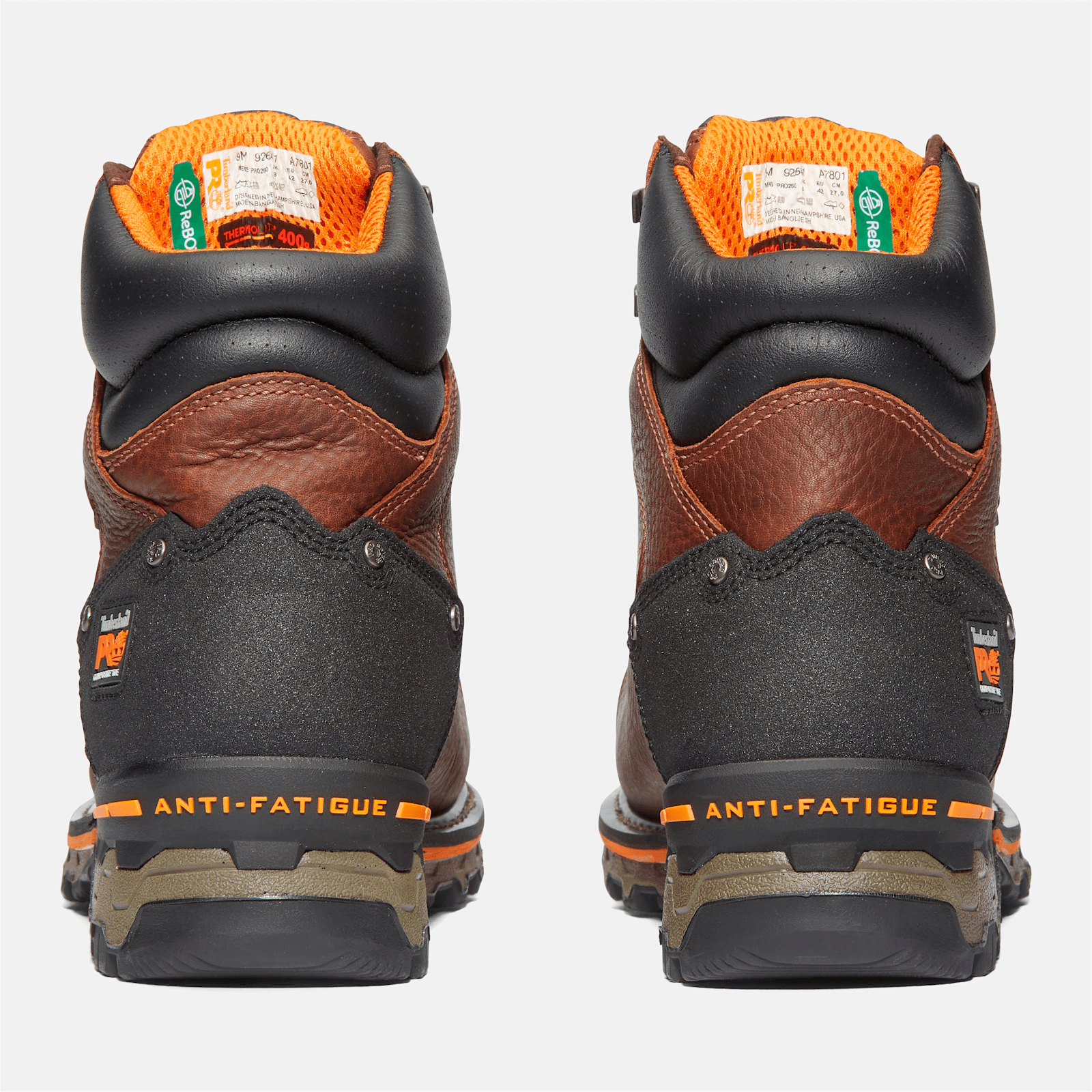 We designed our heavy-duty insulated Boondock manufacturing boots to provide industrial-grade protection from every angle. Starting with their premium Timberland® waterproof leather uppers with internal waterproof, breathable membranes for maximum waterproof protection and resistance to blood-borne pathogens, we added 400 grams of insulation for cold-weather comfort and to retain heat, our molded Timberland PRO® rubber toe protectors that are as thick as standard boot outsoles and backed with composite safety toes, rigid external heel cups to support lateral movement, and our Anti-Fatigue Technology footbeds for all-day shock absorption and energy return. You'll also find protection from below with our heat-, slip-, oil, and abrasion-resistant, non-marking, lightweight, All-Weather TPU outsoles that offer enhanced traction in extreme environments. Plus, their breathable, moisture-wicking linings are made of ReBOTL™ fabric containing at least 50% recycled plastic with an antimicrobial treatment for odor control.