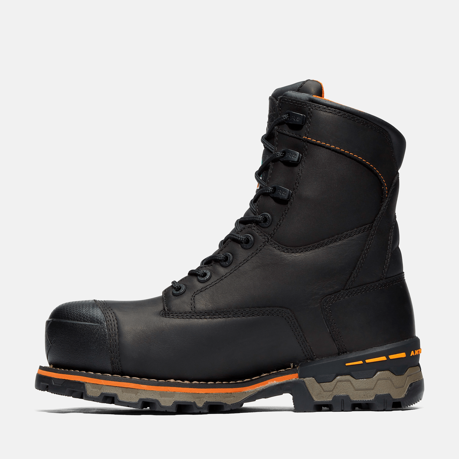 We designed our heavy-duty insulated Boondock manufacturing boots to provide industrial-grade protection from every angle. Starting with their premium Timberland® waterproof leather uppers with internal waterproof, breathable membranes for maximum waterproof protection and resistance to blood-borne pathogens, we added 200 grams of insulation for cold-weather comfort and to retain heat, electrical shock protection, our molded Timberland PRO® rubber toe protectors that are as thick as standard boot outsoles and backed with composite safety toes, rigid external heel cups to support lateral movement, and our Anti-Fatigue Technology footbeds for all-day shock absorption and energy return. Their breathable, moisture-wicking linings are made of ReBOTL™ fabric containing at least 50% recycled plastic with an antimicrobial treatment for odor control. You'll also find lightweight protection from below with non-metallic, puncture-resistant plates and their heat-, slip-, oil-, and abrasion-resistant, non-marking All-Weather TPU outsoles that offer enhanced traction in extreme environments.